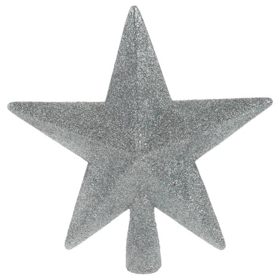Szpic na choinkę w kształcie gwiazdy o wymiarach 19 x 19,5 cm. Wykonany w kolorze srebrnym z mieniącym się brokatem. Doskonały jako efektowny czubek dla świątecznej choinki.