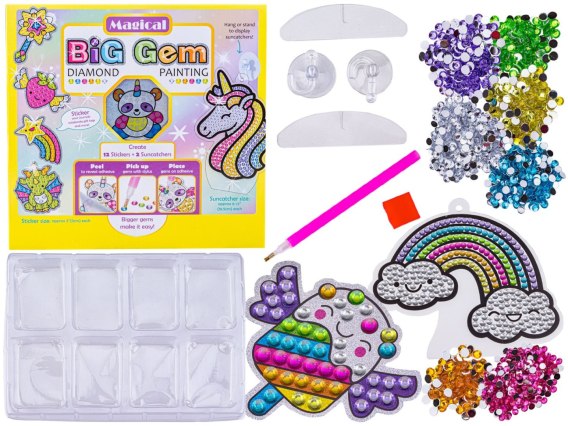 Oferowany zestaw zawiera wszystkie niezbędne elementy do wykonania gotowych układanek w tematyce bajkowych stworzeń :) Zabawa polega na tym aby odpowiednimi, bajecznie kolorowymi diamencikami wyłożyć pola na naklejkach.