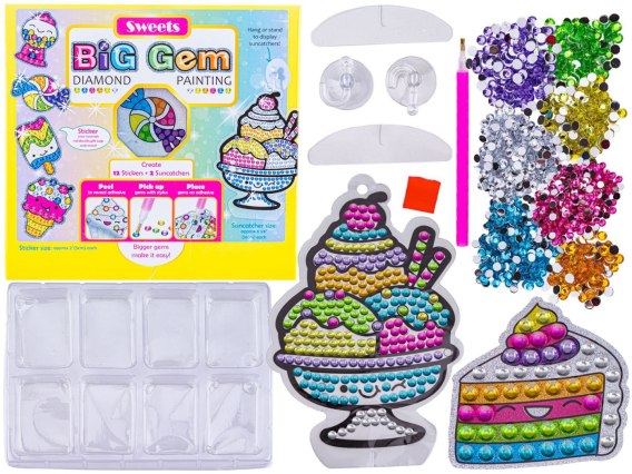 Oferowany zestaw zawiera wszystkie niezbędne elementy do wykonania gotowych układanek w tematyce słodkości :) Zabawa polega na tym aby odpowiednimi, bajecznie kolorowymi diamencikami wyłożyć pola na naklejkach.