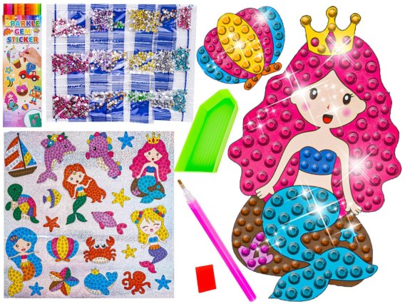 Oferowany zestaw zawiera wszystkie niezbędne elementy do wykonania gotowych układanek w tematyce oceanu i uroczych syrenek :) Zabawa polega na tym aby odpowiednimi, bajecznie kolorowymi diamencikami wyłożyć pola na naklejkach.