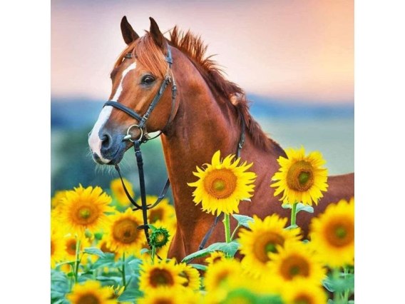 Haft Diamentowy, Obraz, Mozaika Diamentowa Diamond Painting, KOŃ W SŁONECZNIKACH 30x30cm
