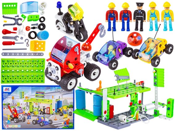 • Klocki Konstrukcyjne MIASTO 340 El. Pojazdy, Stacja Benzynowa, Auto, Samochód, Samolot Do Rozkręcania I Skręcania 10w1