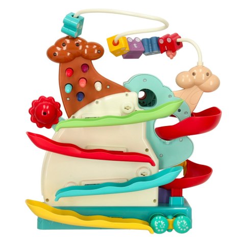 Zabawka posiada nie jeden, ale aż dwa tory, po których mogą toczyć się kolorowe kulki lub samochodzik. Dodatkową atrakcją są kolorowe wagoniki z cyframi, które dziecko może przesuwać i obracać. Ma również grę „nakarm ptaszka", która polega na zebraniu robaczków i nakarmienie nimi ptaka.