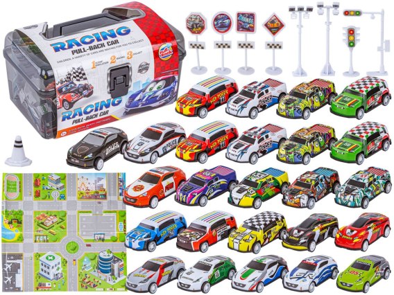 Auta Resoraki 25 Szt. Samochody w kuferku + Podkładka + Akcesoria, Zestaw samochodów wyścigowych