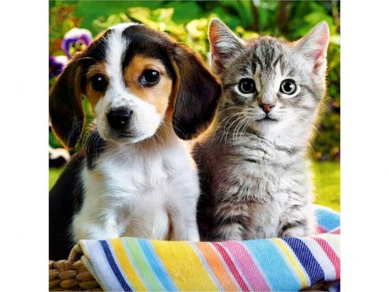 • Haft Diamentowy, Obraz, Mozaika Diamentowa Diamond Painting, SZCZENIAK Z KOTKIEM 30x30cm