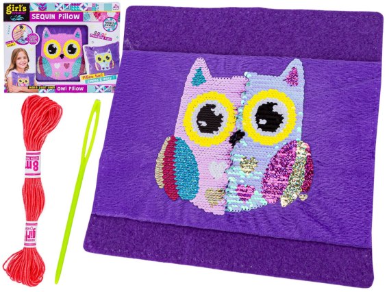 Środek poduszki ozdabia sowa z kolorowymi cekinami, które po przesunięciu ręką zmienią kolor.