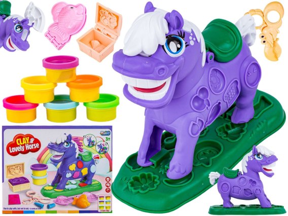 Zestaw z uroczym konikiem zapewni Twojemu dziecku sporo kreatywnej zabawy. To fantastyczny pomysł dla dzieci, które lubią zabawę masą plastyczną. Zwierzątko można dowolnie przyozdabiać, odciskać różne wzory a także wycisnąć mu kolorową, ciastolinową grzywę. To super wciągające.