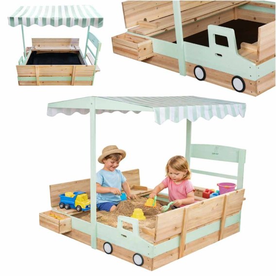 Przed użyciem zapoznaj się z instrukcją obsługi. Montaż piaskownicy powinna wykonać wyłącznie osoba dorosła. Produkt nieodpowiedni dla dzieci poniżej 3 roku życia - zawiera małe elementy i ruchome części (obrotowy dach, zamykane siedziska). Do użytku pod bezpośrednim nadzorem osoby dorosłej. Nie używaj w czasie silnego wiatru i burzy. Regularnie sprawdzaj stabilność daszku, elementów mocujących i stan drewna. Produkt łatwopalny. Trzymaj z dala od ognia.