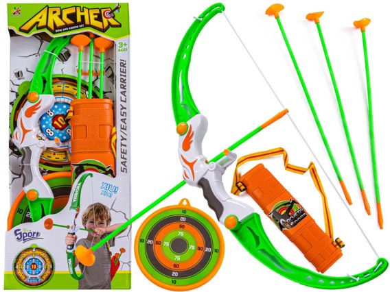 Zestaw wyposażony został w zabawkowy łuk, który swoim wyglądem nawiązuje do prawdziwych sportowych łuków. 3 strzały są w pełni bezpieczne dla Twojego dziecka, ponieważ zakończone są przyssawkami a nie grotami :) Aby strzały mieć zawsze przy sobie - schowaj je w kołczan. Kołczan posiada regulowany pasek, dzięki czemu możemy łatwo dostosować go tak, aby nie spadał podczas zabawy. Aby wyćwiczyć swoja celność zestaw dodatkowo wyposażony został w tarczę. Zawieś tarczę i rozpocznij zawody:) Zestaw łuczniczy idealnie nadaje się do zabawy na świeżym powietrzu.