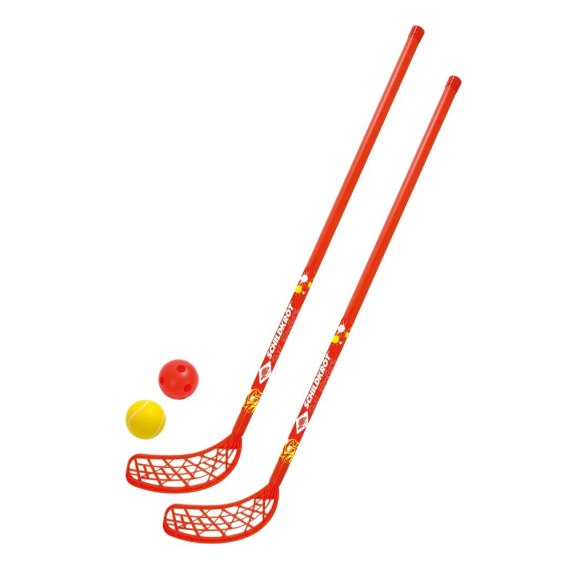 • dwa kije hokejowe wykonane z wytrzymałego tworzywa sztucznego w kolorze czerwonym, długość 110 cm, ostrze proste