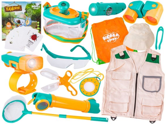 Zestaw do zabawy na świeżym powietrzu pozwala wcielić się w rolę prawdziwego odkrywcy! W zestawie znajduje się mnóstwo akcesoriów, które pozwolą wprowadzić dziecko w świat obserwacji przyrody. Jest tu m.in. lornetka do obserwacji ptaków, lupa, siatka na owady oraz kompas.